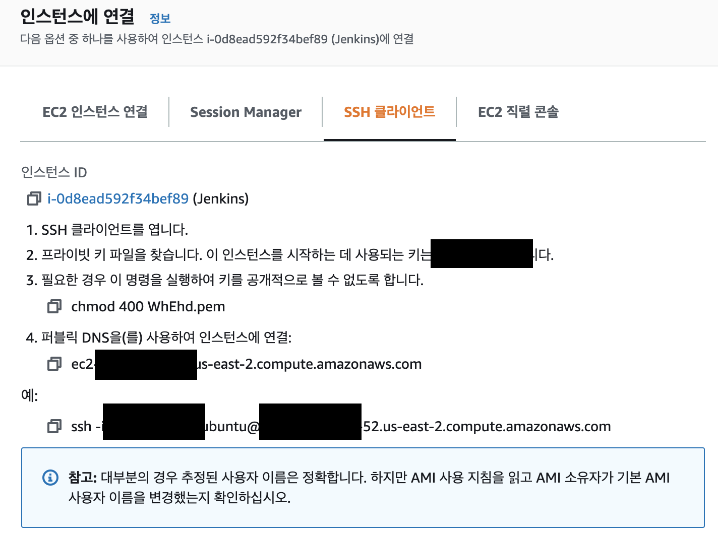- 접속 방법은 해당 인스턴스에서 연결을 클릭하면 확인할 수 있습니다.