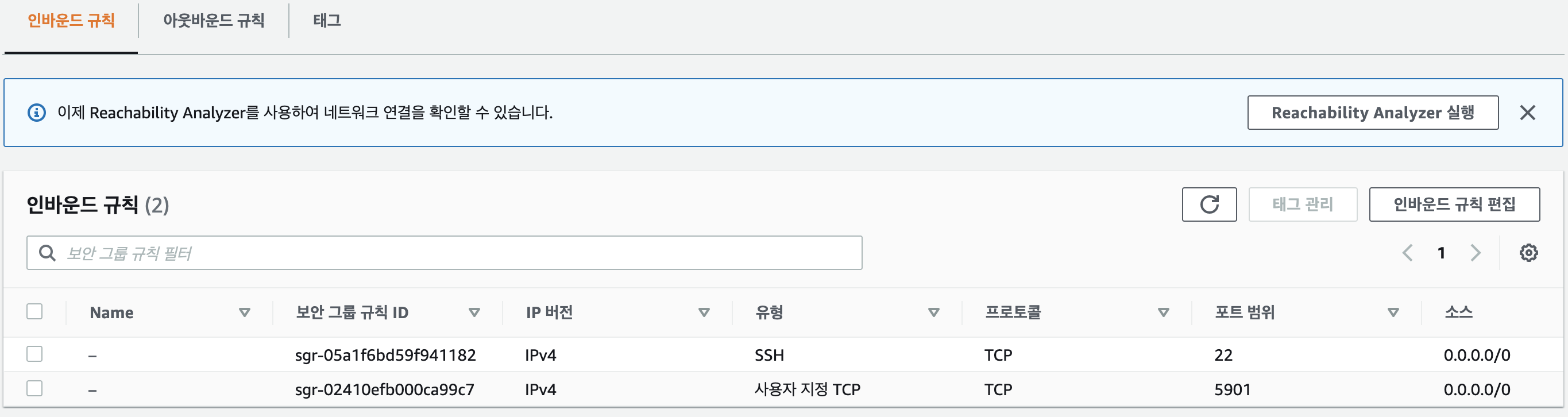 6. AWS 로그인 후 보안그룹에서 인바운드 규칙에서 5901 포트를 열어줍니다.